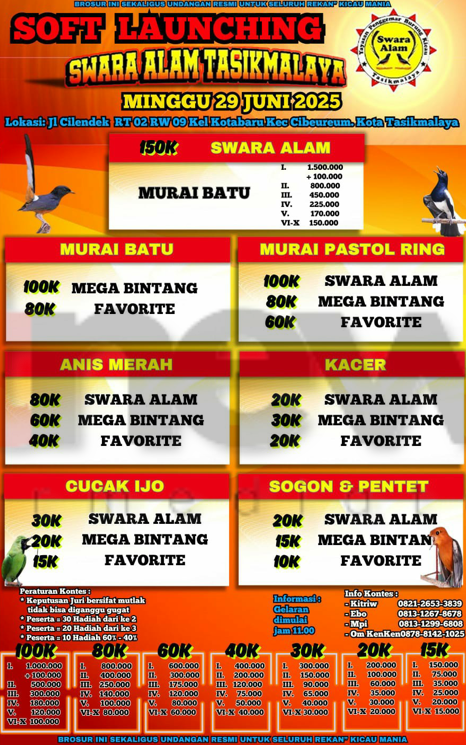 Ajang ini bukan hanya sekadar kontes, tapi juga wujud kecintaan dan apresiasi kita terhadap seni burung berkicau. Hadiri, ramaikan, dan jadilah bagian dari sejarah awal berdirinya Swara Alam Tasikmalaya!